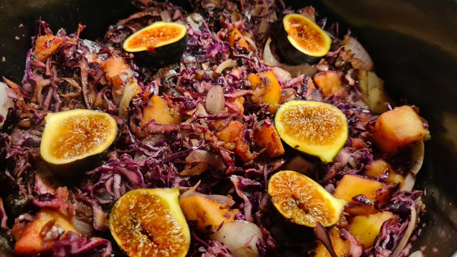 4Tip. Once all has been cooked you might have lost some of the apple and figs. Peel and cube an extra apple and quarter a few figs and put in the pan 30 minutes before serving. Ideally as well put in a big strip of smoked porkbelly and let it cook with the cabbage. Delicious!