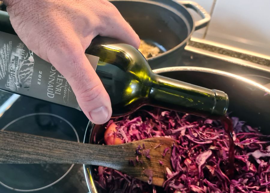 2After around 10 minutes add bay leaves, the shredded red cabbage, add the vingar, cinnamon sticks and close the pot for at least 15 minutes